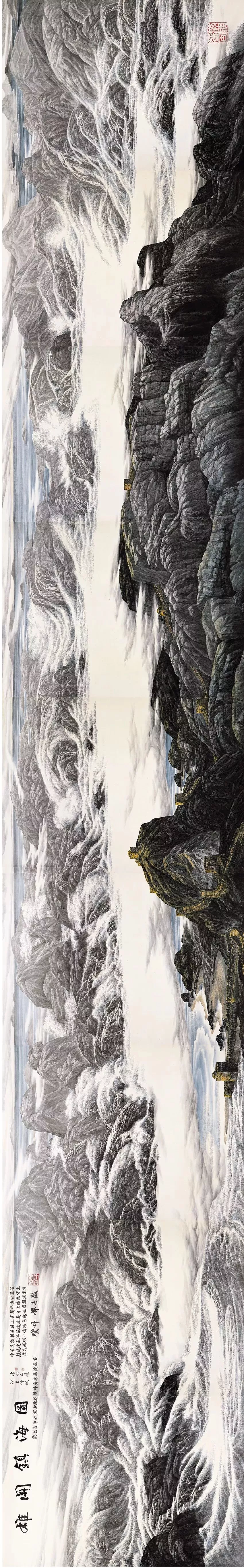子敬畫海還有一個特色是不拘技法。他實行拿來主義,帶著版畫畫種的手法,以及嚴謹、細膩的專業(yè)訓練,不拘一格的博采用于畫海的各類畫種的表現(xiàn)形式和技法,筆隨心走,隨機生發(fā),在西方推崇的自然真實和中國傳統(tǒng)文人畫的空淡虛靈之間直抒胸臆,不為法所障,力求蓬勃向上的情調,處處蘊涵著一股大氣。他在這一方面的探索已遠非山水畫自身的問題,實際上已經擴展到構建一種文化形態(tài)的范疇。