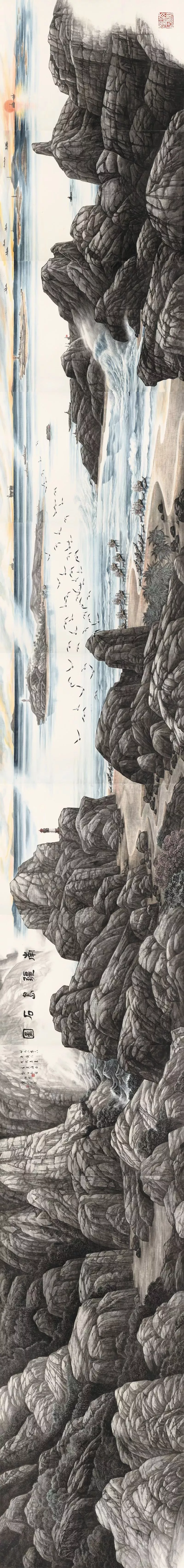 構圖險中求穩(wěn)是子敬畫海的特色。在滿構圖中打破方正穩(wěn)定的傳統(tǒng)圖式,大膽偏離中軸線,將重心移至邊角尋求新的平衡,構圖雄奇,大開大合,于形與神、抽與具、擬與不擬之間追求符號化與意境美的完臻統(tǒng)一,他的海才顯得鏗鏘稚拙,幽闐遼遠。