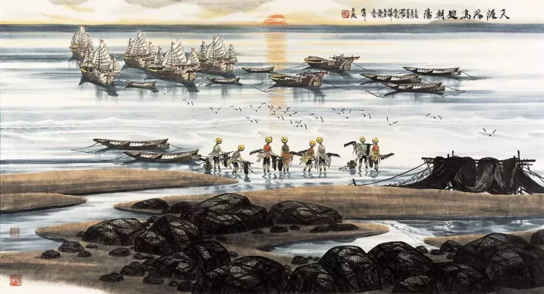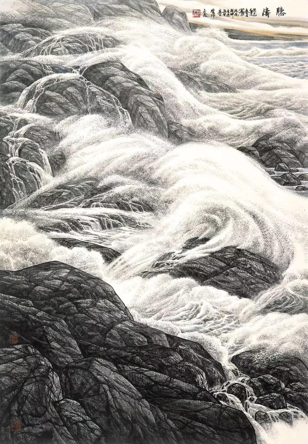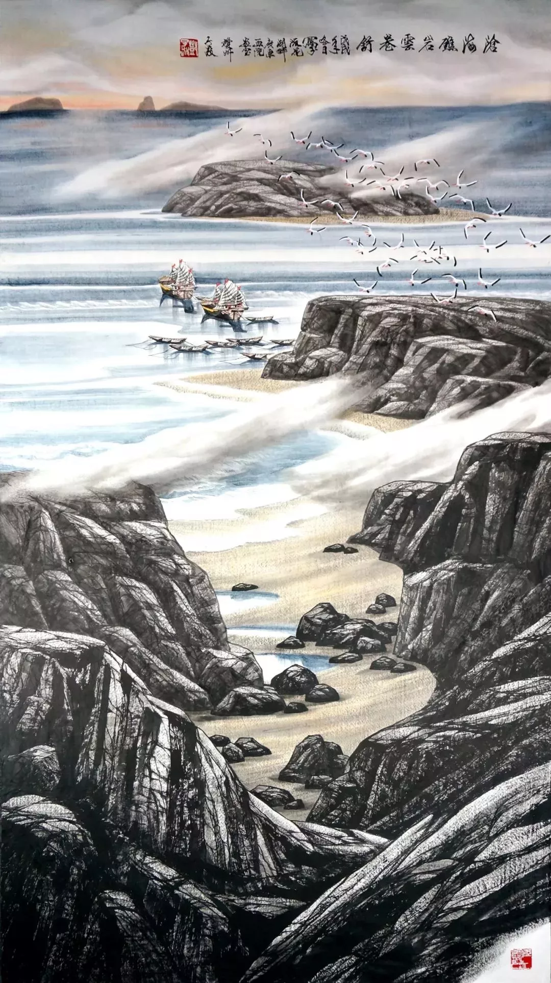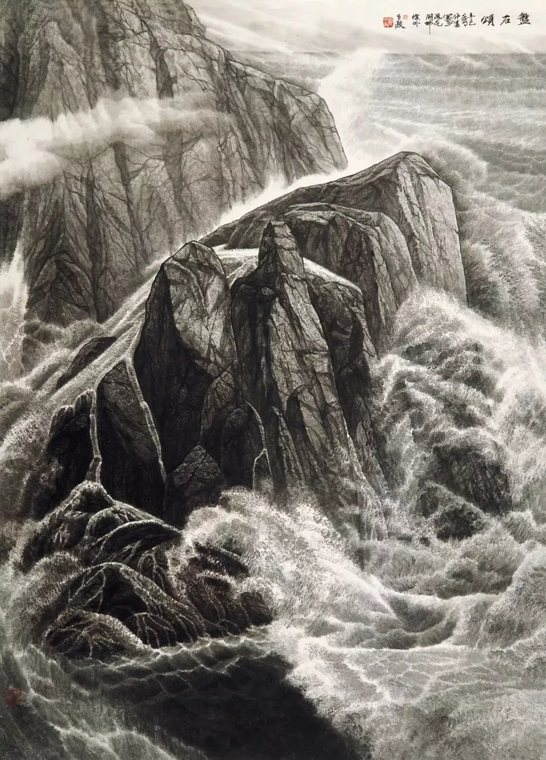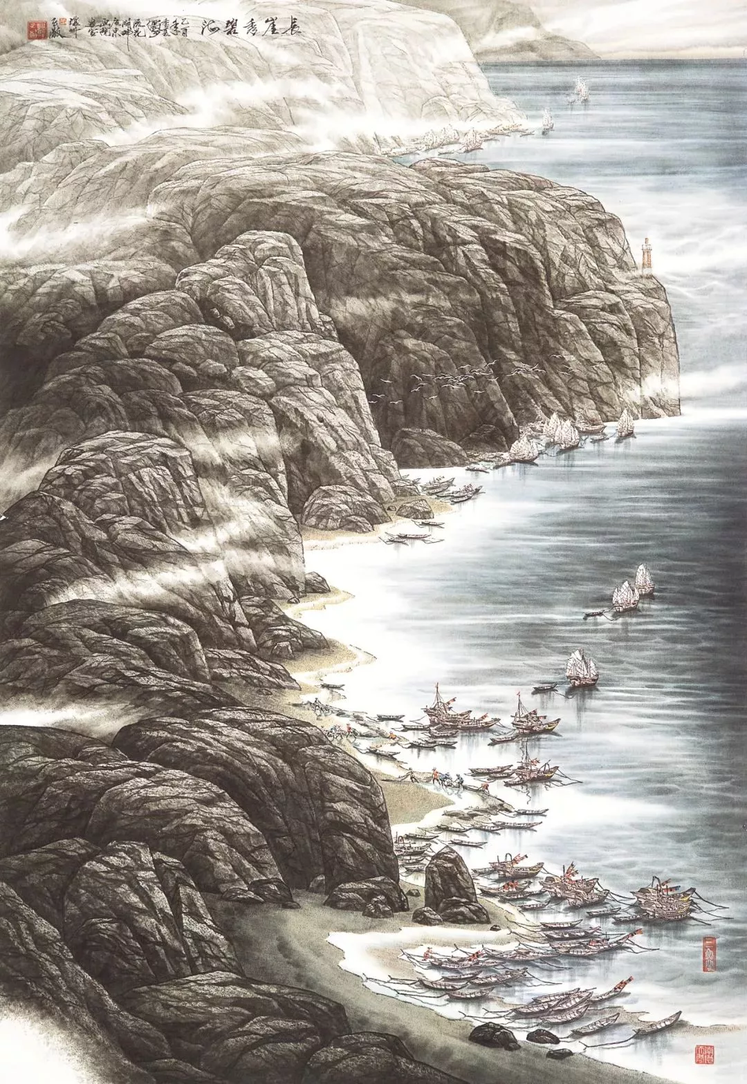他說“那里有我的?;?,有我作為一個藝術家的夢想和心靈歸宿——它是我的精神家園。畫海,挑戰(zhàn)這一前所未見的領域,亦是碰撞前所未有的機遇”,于是,通過象征性把筆墨技巧強化到精神家園的層次,中國畫壇的視野里出現(xiàn)了海的系列:《盤石頌》《波光巖峻》《石島》《風帆》《春潮》《多姿的海灣》《大浪淘沙》《激流》......
