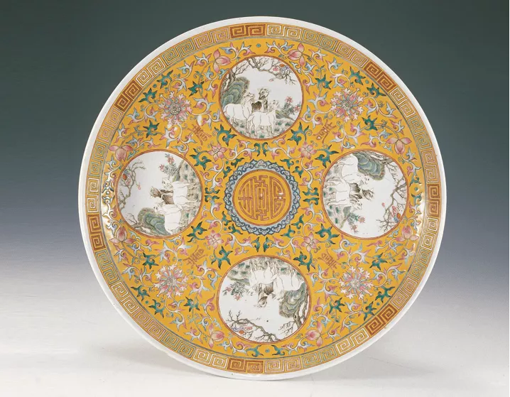以光緒年制黃地粉彩三羊開泰瓷盤為靈感