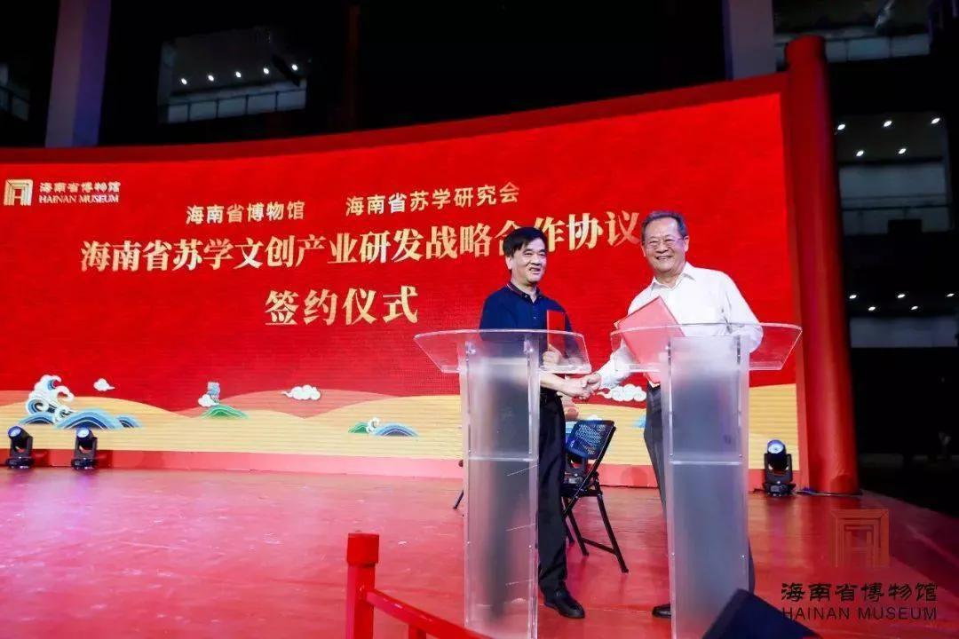活動現(xiàn)場,海南省博物館館長陳江、海南省新聞工作者協(xié)會副主席李公羽、海南省蘇學研究會副會長海濱一起探討“文物+旅游 博物館可以走的更遠”。同時,海南省博物館與海南省蘇學研究會舉行了海南省蘇學文創(chuàng)產業(yè)研發(fā)戰(zhàn)略合作協(xié)議簽約儀式。