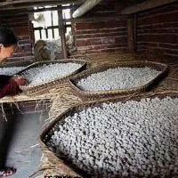 所選原料用早谷,晚谷、糯谷更具韌性均不行。制作時,先將早谷放入石碓中碓成粉,每百斤稻谷加水七十斤左右,再加入早已備好的酒餅草和桃葉,充分伴勻,做到不干不濕,手握能成形,放入框架內壓碾成餅,再打刀割成條,切成小塊,然后放入發(fā)酵房內。兩天后,待細小絨毛全消退了,再進行曬干,此時,酒餅方告制成。